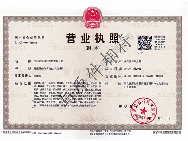 關(guān)于我們   河北力揚(yáng)水利機(jī)械有限公司,成立于2016年,地址河北省邢臺(tái)市新河縣富強(qiáng)街與九龍北路交匯處西南角具備生產(chǎn)及供應(yīng)、安裝能力。我們公司位于董振堂將軍故里,河北省邢臺(tái)市新河縣九龍工業(yè)區(qū),是一家集設(shè)計(jì)、生產(chǎn)、銷售、安裝、售后一體的綜合性水利機(jī)械廠家,現(xiàn)有人員共40余名,獲有國家頒發(fā)的全國工業(yè)產(chǎn)品生產(chǎn)許可證、ISO質(zhì)量管理體系認(rèn)證、環(huán)境體系認(rèn)證、職業(yè)健康體系認(rèn)證并且我公司通過水利相關(guān)部門水工金屬結(jié)構(gòu)質(zhì)量檢驗(yàn)中心的考核和監(jiān)督下獲得了:認(rèn)證頒發(fā)的四項(xiàng)產(chǎn)品認(rèn)證證書(平面閘門、弧形閘門、回轉(zhuǎn)式清污機(jī)、耙斗式清污 ABOUT US